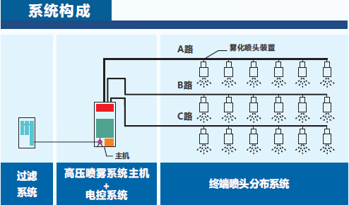 智能喷雾系统是由智能喷雾主机(集成电控)、微米级雾化喷头、Ⅲ级过滤系统、专用高压不锈钢管及配件等设备组成。